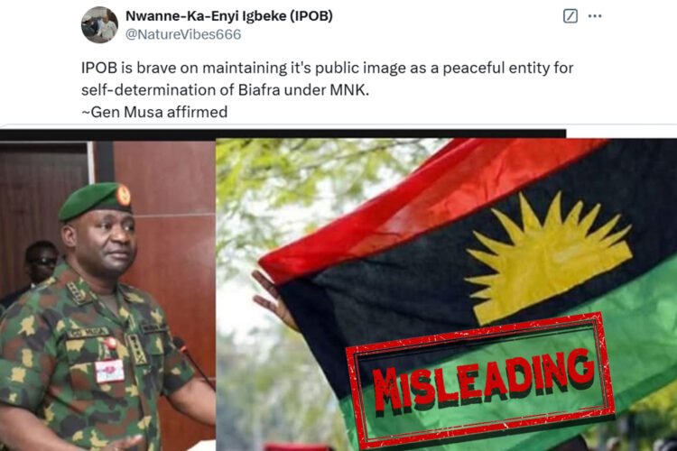 A post on the micro-blogging platform, X attributes a statement to the Chief of Defense Staff, CDS, General Christopher Musa, claiming that the CDS said the Indigenous People of Biafra, IPOB, were brave people for maintaining its image as a peaceful entity under Mazi Nnamdi Kanu. On December 15, 2024, an X user, @NatureVibes666 posted […]