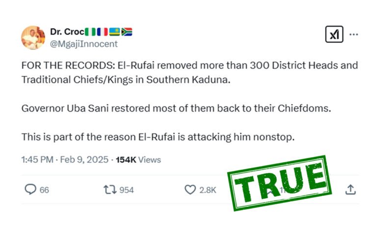 CLAIM: Former Governor El-Rufai Removed 300 District Heads and Traditional Chiefs While His Successor Reinstated Them Umoh Umoh There is a circulating claim that the former governor of Kaduna state, Mallam Nasir El-Rufai ousted over 300 district heads and traditional chiefs/kings in southern Kaduna On February 9, 2025, the claim was shared on X by […]