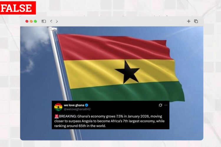 The claim that Ghana’s economy grew up to 7.5% in January 2026, moving closer to overtake Angola, ranked 7th best economy in Africa, and 65th in the world, is FALSE.