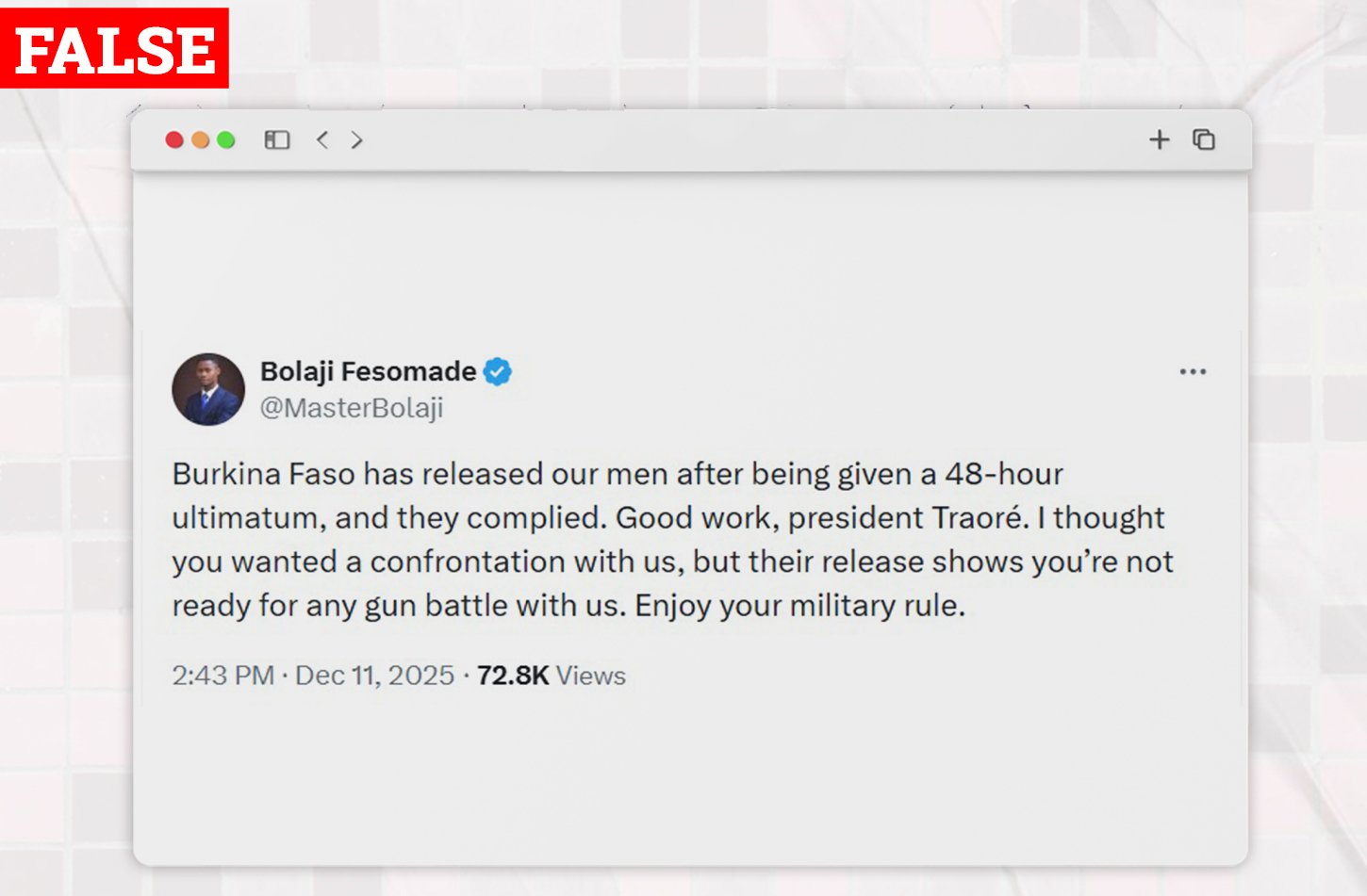 Did Burkina Faso Release Detained Military Personnel After 48-Hour Ultimatum from Nigeria? On December 11, 2025, an X user @MasterBolaji claimed that... Read more.