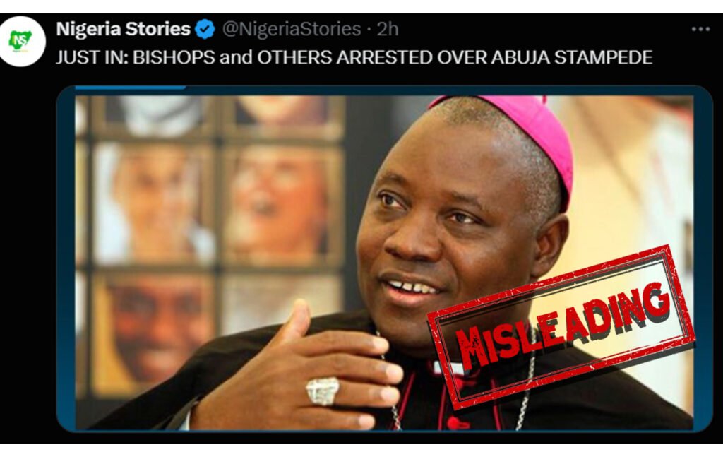 The post had the image of a bishop with the caption, ‘JUST IN: BISHOPS and OTHERS ARRESTED OVER ABUJA STAMPEDE.’