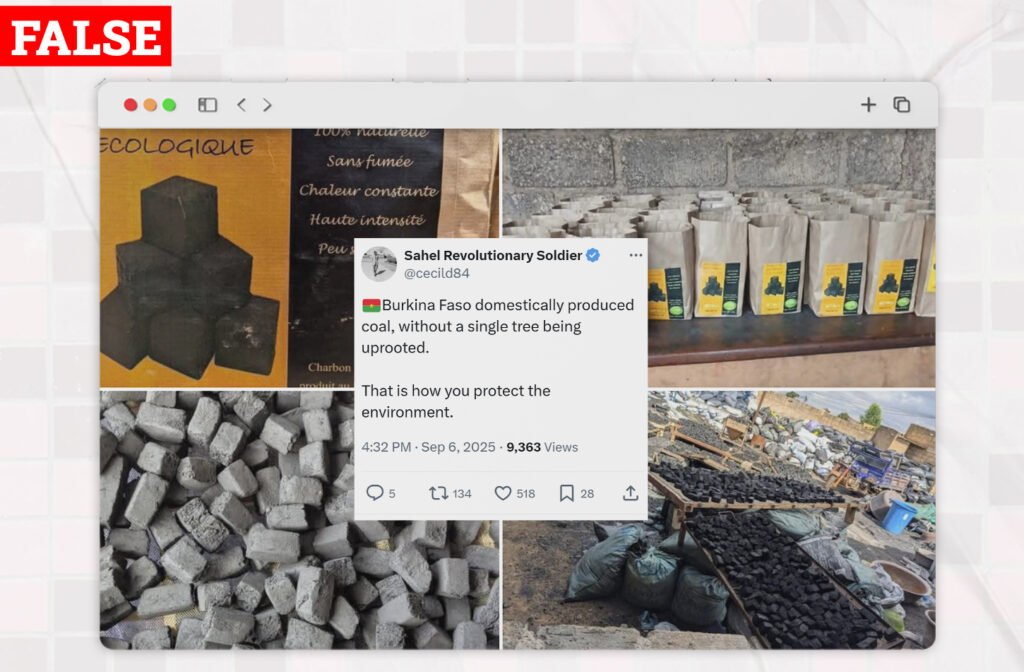 On September 6, 2025, an X user @cecild84 claimed that Burkina Faso has started producing coal domestically, without uprooting a single tree, as an environmentally friendly initiative. This claim was posted with the image of packaged charcoal blocks and captioned, â€œđŸ‡§đŸ‡« Burkina Faso domestically produced coal, without a single tree being uprooted. That is how you protect the environment”.