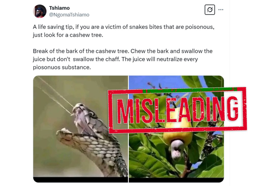 On September 29, 2022, an X user, @NgomaTshiamo made a post claiming that chewing and swallowing the juice extracted from the bark of cashew trees can neutralise the venom of a poisonous snake.