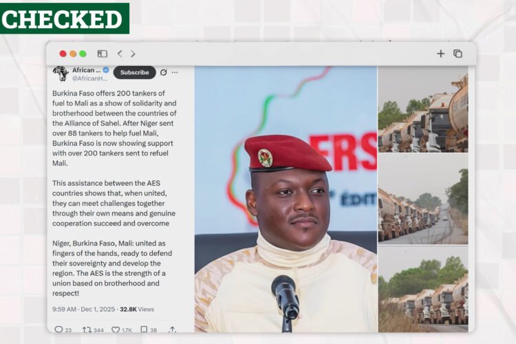 CLAIM: Niger And Burkina Faso Deliver 288 Fuel Tankers to Mali On December 1, 2025, an X user @AfricanHub claimed that Burkina Faso has sent over 200 fuel tankers to Mali as a show of solidarity within the Alliance of Sahel States, AES, following Niger’s delivery of 88 tankers to Mali. The post had a […]