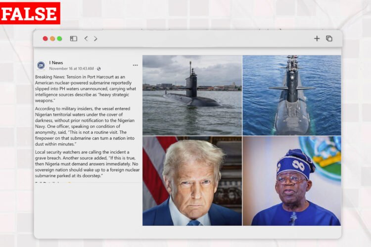 CLAIM: U.S. Nuclear-Powered Submarine Slipped Into Port Harcourt Waters Unannounced A Facebook account, @INews claims that a U.S. nuclear-powered submarine “slipped into Port Harcourt waters” without notification, carrying “heavy strategic weapons. The post which was shared on November 16, 2025 had an image of a submarine and President Trump and Tinubu with a caption that […]