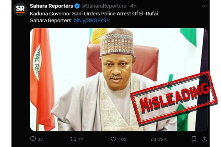 CLAIM: Kaduna Governor, Sani Orders Police Arrest of Nasir El-Rufai On January 1, 2025, Sahara Reporters, a prominent Nigerian news outlet, made a post on X claiming that former Kaduna State Governor, Nasir El-Rufai, had been arrested on the orders of the current Governor of Kaduna State, Uba Sani. The X post was captioned, “Kaduna […]
