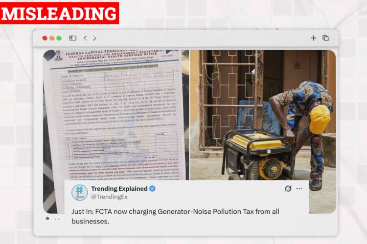 CLAIM: FCTA Imposes Generator Noise Pollution Tax On Abuja Residents A page on X @TrendingEx has claimed that the Federal Capital Territory Authority, FCTA, now charges tax for generator noise pollution. The post, which had images of the notice and a man with his generator, was captioned “Just In: FCTA now charging Generator-Noise Pollution Tax […]