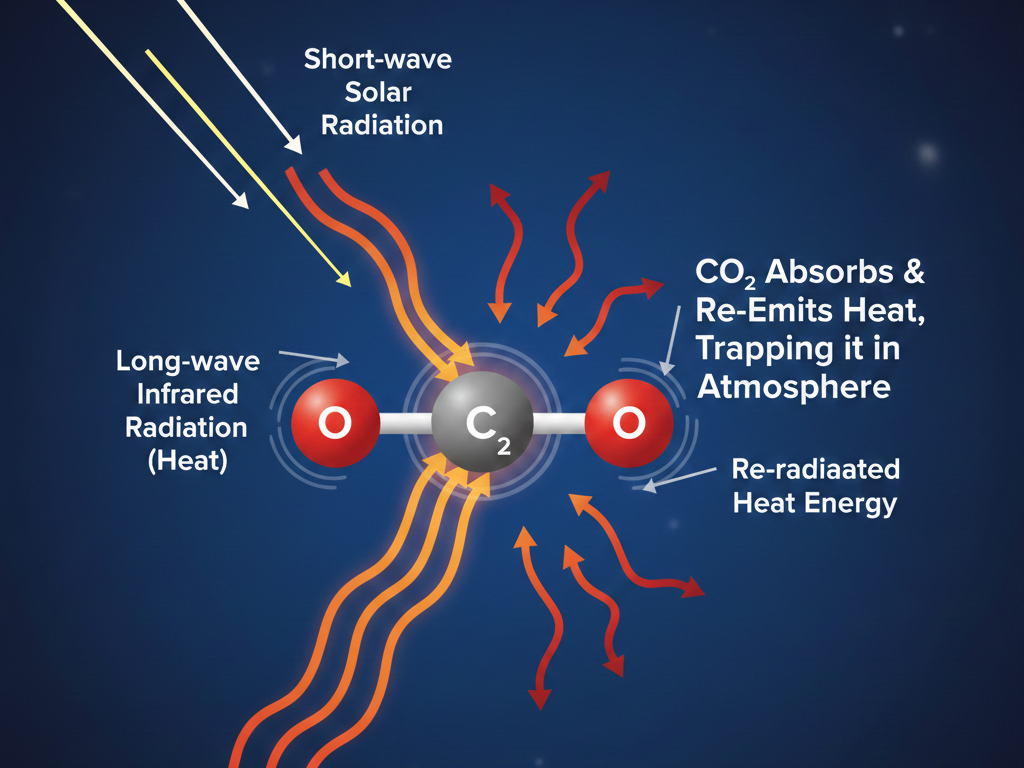 CO₂’s greenhouse gas effect works like this: it doesn’t make the air toxic, but it absorbs heat that Earth’s surface emits and slows its escape to space. This traps heat and leads to a warmer climate, which influences weather patterns and contributes to changes in the climate system.