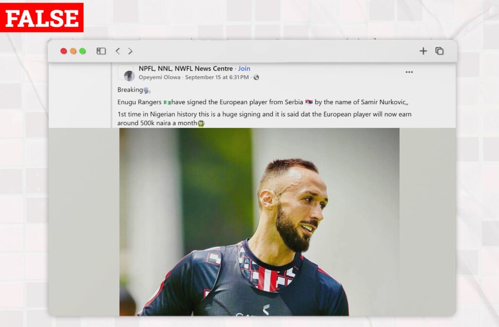 On September 15, 2025, a Facebook user posted on the group, ‘NPFL, NNL, NWFL News Centre’ claiming that Nigerian Premier League side Enugu Rangers had secured the services of a European player, thereby making the team the first in the country to achieve such a feat. The post which has an image of the player was captioned, “Breaking🗣 Enugu Rangers 🇳🇬have signed the European player from Serbia 🇷🇸 by the name of Samir Nurkovic,, 1st time in Nigerian history this is a huge signing and it is said dat the European player will now earn around 500k naira a month🙆🏻‍♂️.”