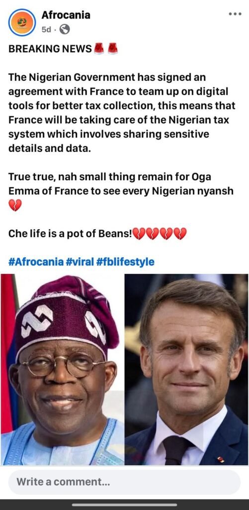 Facebook user @Afrocania says that the Nigerian Government has signed an agreement with France that allows the country to take over Nigeria’s tax system and access sensitive taxpayer data. According to the post which had an image of President Bola Tinubu and Emmanuel Macron, Nigeria is teaming up with France on digital tools for better tax collection, and it involves sharing sensitive details and data.