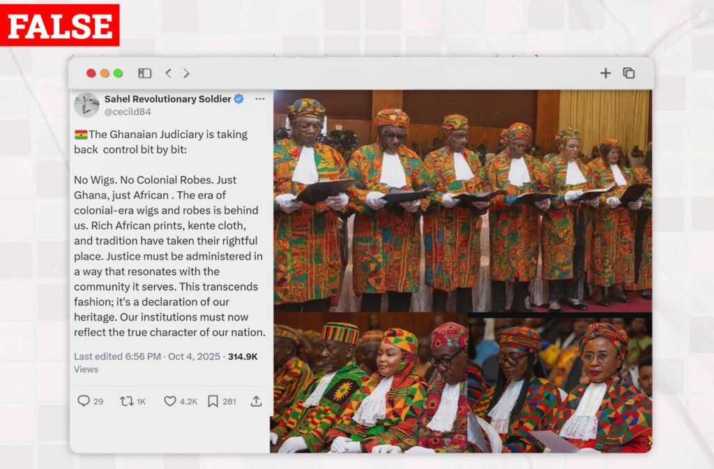 On October 4, 2025, an X user @cecild84 claimed that Ghana’s judiciary has discarded colonial-era wigs and robes in favour of African prints and traditional attire. The post had three images of lawyers in traditional African prints attire, captioned: “🇬🇭The Ghanaian Judiciary is taking back control bit by bit: No Wigs. No Colonial Robes. Just Ghana, just African. The era of colonial-era wigs and robes is behind us. Rich African prints, kente cloth, and tradition have taken their rightful place. Justice must be administered in a way that resonates with the community it serves. This transcends fashion; it's a declaration of our heritage. Our institutions must now reflect the true character of our nation”