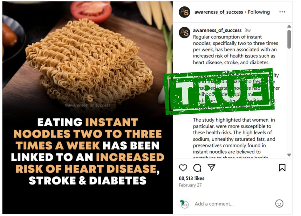 On February 27, 2025, an Instagram user, awareness_of_success posted an image with the text, “EATING INSTANT NOODLES TWO TO THREE TIMES A WEEK HAS BEEN LINKED TO AN INCREASED RISK OF HEART DISEASE, STROKE & DIABETES”.