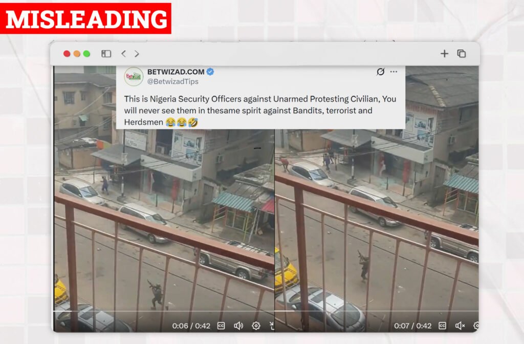 A verified X handle posted a 42 seconds video, claiming that unarmed protesters are being shot by Nigerian security personnel. The post is captioned, āThis is Nigeria Security Officers against Unarmed Protesting Civilian, You will never see them in thesame spirit against Bandits, terrorist and Herdsmenššš¤£ā