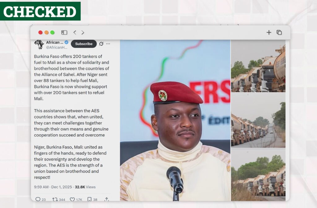 On December 1, 2025, an X user @AfricanHub claimed that Burkina Faso has sent over 200 fuel tankers to Mali as a show of solidarity within the Alliance of Sahel States, AES, following Niger’s delivery of 88 tankers to Mali. The post had a collage of Burkina Faso’s leader, Ibrahim Traoré and lined up tankers, with the caption,
