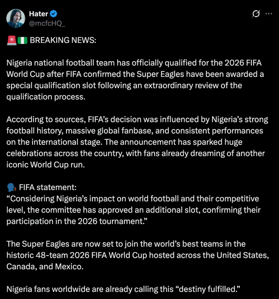 The claim that Nigeria has been awarded a special 2026 World Cup qualification slot by FIFA is entirely FALSE. The Super Eagles lost the CAF play-off final to DR Congo on penalties in November 2025. The NFF’s subsequent eligibility petition was formally dismissed by the FIFA Disciplinary Committee. And the confirmed list released by FIFA does not include Nigeria.