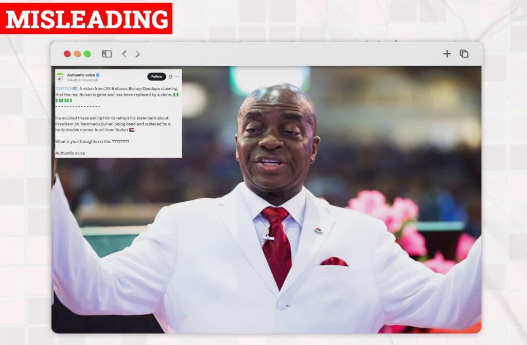 A newsblog on X posted a video which claims that in 2018, Bishop David Oyedepo said ex-president Muhammadu Buhari had died and been replaced by a clone. The X user further mocked those who had asked for a retraction of their earlier post which alleged that President Muhammadu Buhari had died a long time ago and was replaced by a body double named Jubril from Sudan.