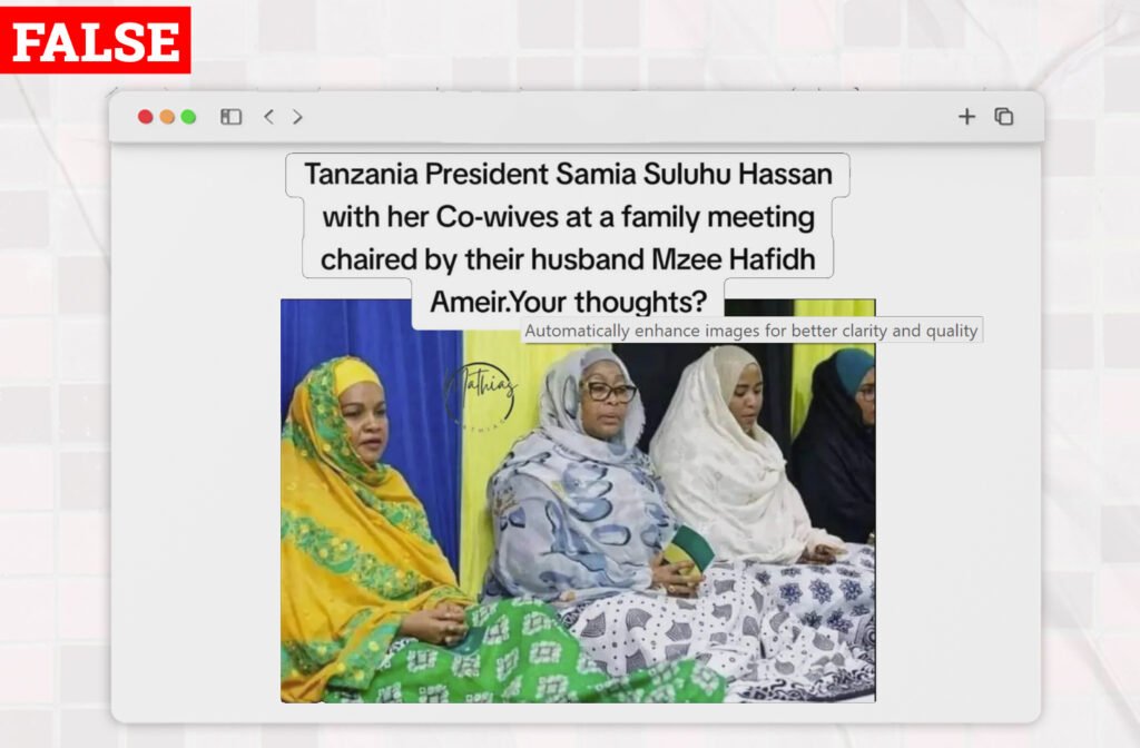 A still video on TikTok with an image of Tanzania’s president, Samia Suluhu Hassan, flanked by 2 other women, claims that this was a family meeting chaired by the president’s husband, Mzee Hafidh Ameir, and the women in the picture are Samia’s co-wives. The video, posted on May 21, 2025 is captioned ”Tanzania President Samia Suluhu Hassan with her Co-wivess at a family meeting chaired by their husband Mzee Hafidh Ameir. Your thoughts?”