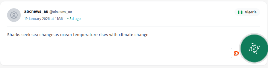 On January 19, 2026, a Reddit user, abcnews_au claimed that due to climate change, sharks are seeking for sea change. This claim, shared on January 19, 2026 was picked from the SPOTAI platform, a disinformation tracker tool.