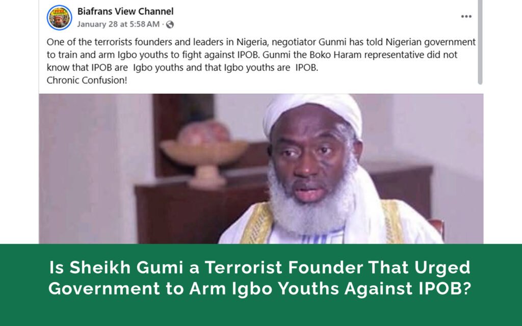 On January 28, 2025, a Facebook page, Biafrans View Channel put up a post claiming that controversial islamic leader, Sheikh Ahmad Gumi is one of the terrorist founders and leaders in Nigeria and he has asked the Nigerian government to train and arm Igbo youths to fight against the Indigenous People of Biafra (IPOB).