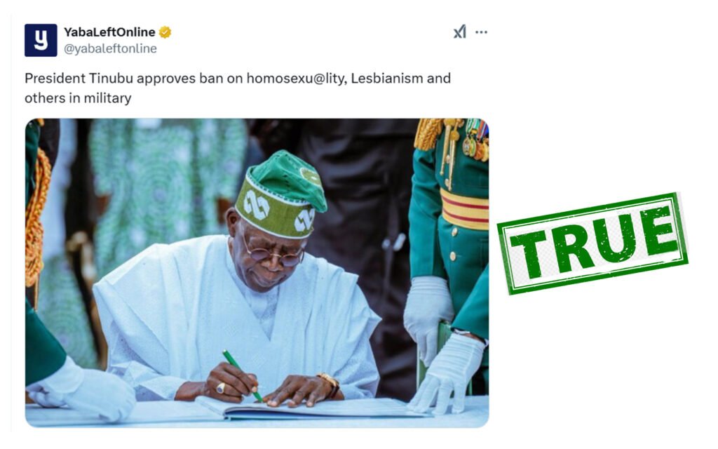 On January 12, 2025, a popular blog and handle on X, @YabaLeftOnline posted a claim saying that President Tinubu has approved a ban on homosexuality and other forms of vices within the military.