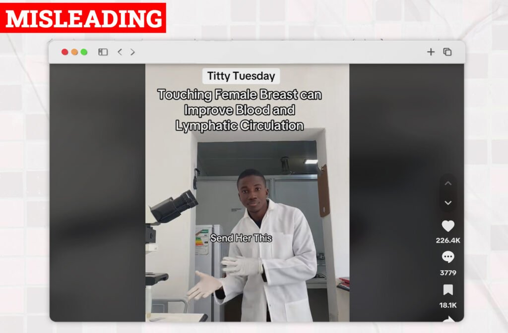A TikTok post claims that touching the breast of a female aids in blood and lymphatic circulation. The 10 seconds video which shows a dancing young man dressed in a laboratory coat was posted on July 1, 2025 with the inscription, “Titty Tuesday Touching Female Breast can Improve Blood and Lymphatic Circulation Send Her This”.