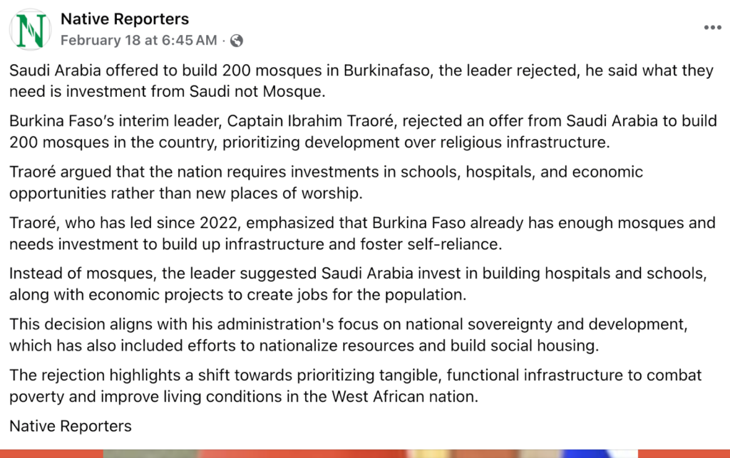 On February 18, 2026 a facebook blogger @NativeReporters made a claim that the Military leader Captain Ibrahim Traoré has rejected Saudi Arabia’s offer to build 200 mosques in Burkina Faso, while pushing for investment in schools, hospitals, and economic development. The post had an image of Traoré with the caption below.