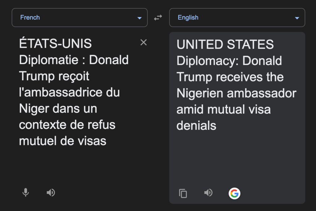 In order to ascertain the originality of the image used in this claim, the fact checker conducted a reverse image search using Google Lens. Results revealed that the woman pictured with Trump is AÏSSATOU CLÉMENCE BARÉ, the Ambassador representing Niger republic in U.S. The image was taken during the official visit of fourteen new ambassadors, including those from the DRC, Ghana, the African Union, Namibia, Niger, and Seychelles to the White House in Washington DC on December 16, 2025.  A translation of the accompanying write up in the claim reads: ‘UNITED STATES Diplomacy: Donald Trump receives the Nigerien ambassador amid mutual visa denials.’