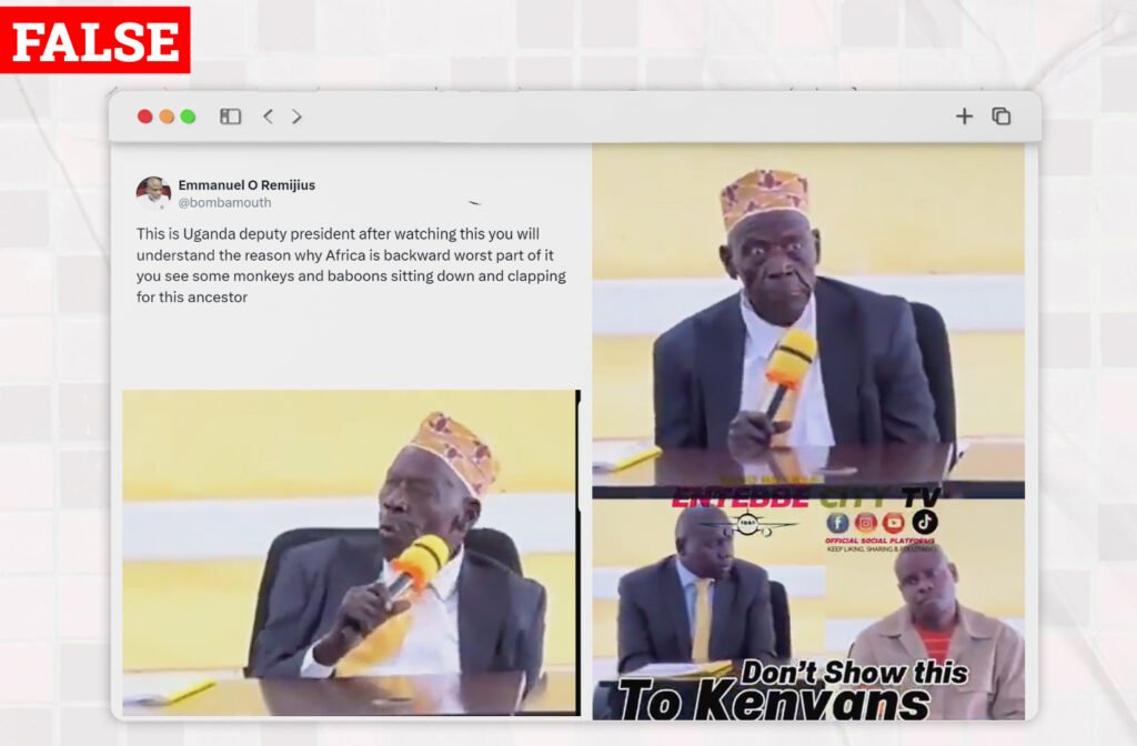 On July 22, 2025, an X user posted a video of a man addressing an event/people. The post was captioned, “This is Uganda deputy president after watching this you will understand the reason why Africa is backward worst part of it you see some monkeys and baboons sitting down and clapping for this ancestor.”