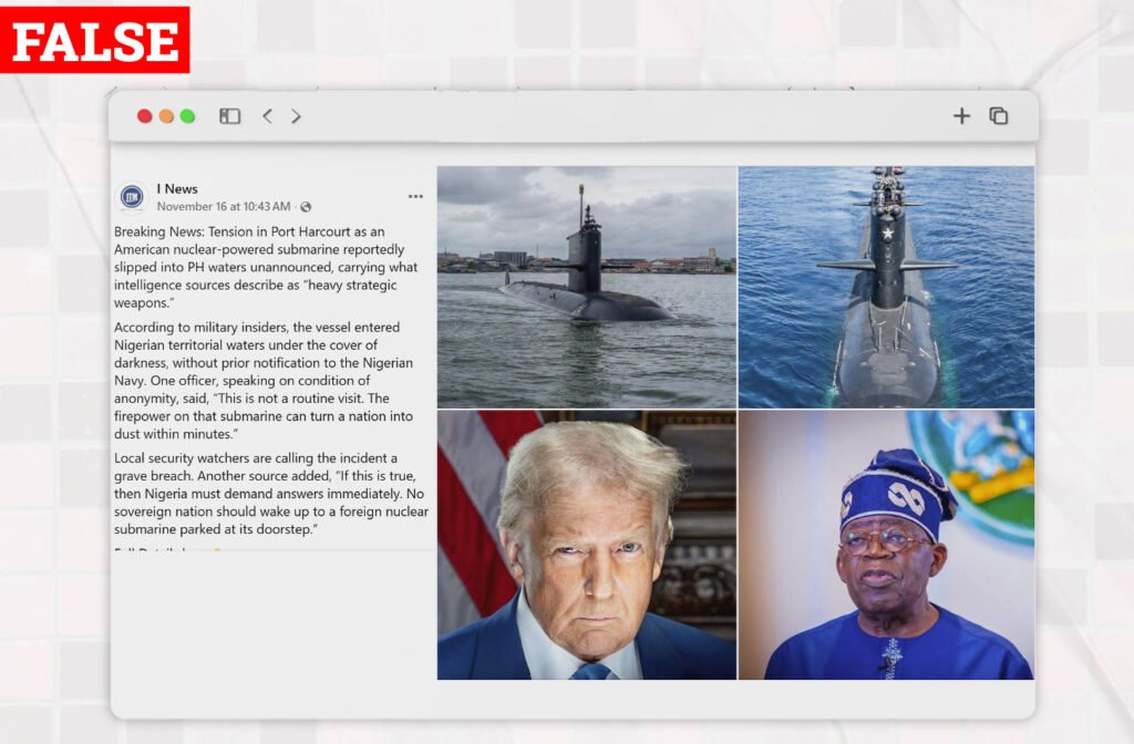 A Facebook account, @INews claims that a U.S. nuclear-powered submarine “slipped into Port Harcourt waters” without notification, carrying “heavy strategic weapons. The post which was shared on November 16, 2025 had an image of a submarine and President Trump and Tinubu with a caption that said according to military insiders, the vessel entered Nigerian territorial waters under the cover of darkness, without prior notification to the Nigerian Navy.