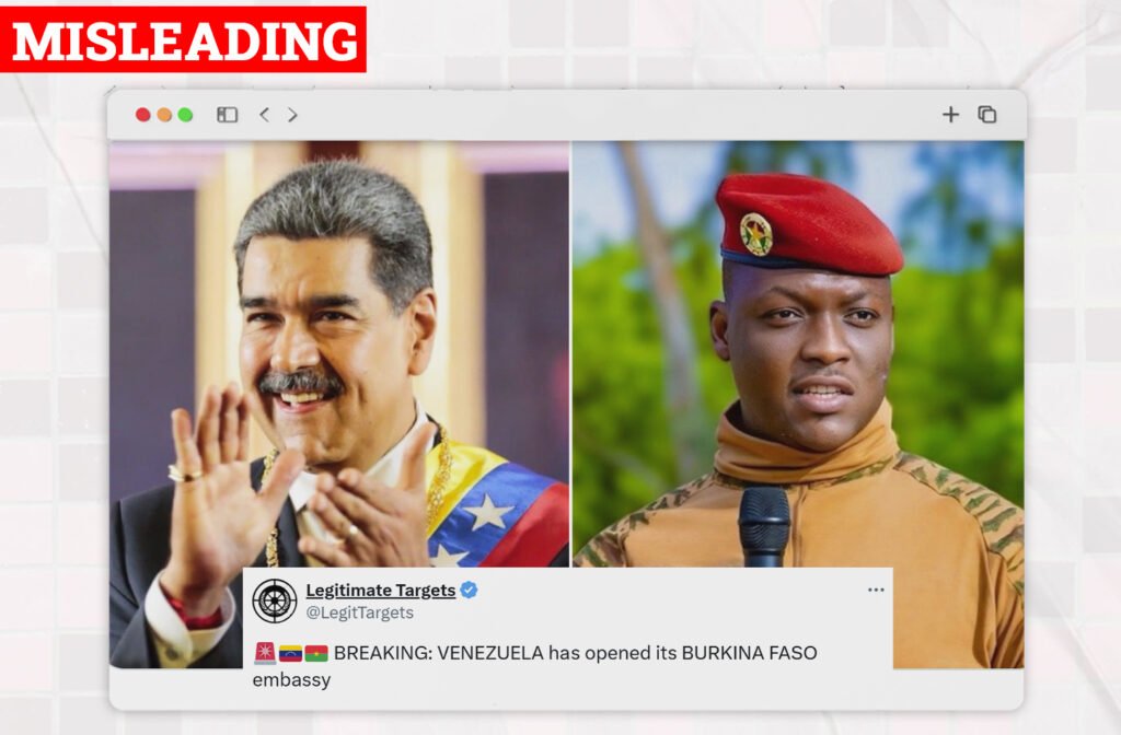 On October 14, 2025 an X user @LegitTargets claimed that Venezuela has officially opened its Burkina Faso embassy. The post had an images of the leaders of Venezuela and Burkina Faso with the caption, âđšđ»đȘđ§đ« BREAKING: VENEZUELA has opened its BURKINA FASO embassy,â