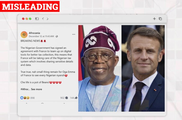 Has France Taken Over Nigeria’s Tax System? Facebook user @Afrocania says that the Nigerian Government has signed an agreement with France that allows the country to take over Nigeria’s tax system and access sensitive taxpayer data. According to the post which had an image of President Bola Tinubu and Emmanuel