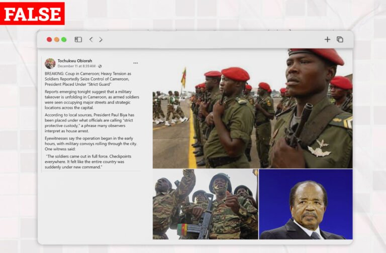 Has There Been A Military Takeover In Cameroon? On December 13, 2025, a Facebook user @TochukwuObiora claimed that soldiers have seized control of Cameroon’s capital and President Paul Biya has been placed under “strict guard,” suggesting a military coup is underway or has succeeded. The post had images of uniformed