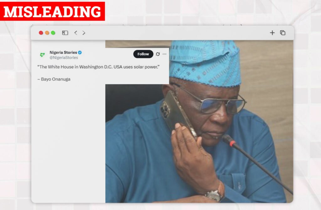 On April 22, 2025, @NigeriaStories posted a picture of Onanuga on X with the caption “The White House in Washington D.C. USA uses solar power. ~ Bayo Onanuga.”