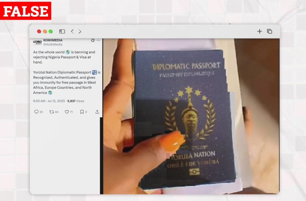 An X user claims there is a Yorùbá Nation Diplomatic Passport that is recognised, authenticated, and gives immunity for free passage in West Africa, Europe Countries, and North America to the holder.